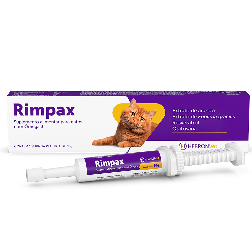 Rimpax é um suplemento alimentar que possui em sua formulação ácidos graxos, citrato de potássio, betacaroteno, vitamina E, betaína, probiótico e prebiótico. Seu uso é indicado para gatos, em qualquer fase da vida, que necessitem do aporte desses nutrientes em casos específicos